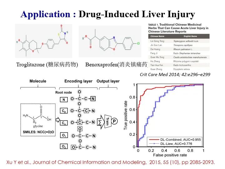 回到药物研发,传统的基于实验的高通量筛选化合物,效率比较低而且风险很大。引入人工智能的目的就是在于提高药物分子设计的效率和成功率、提前预知错误的药物分子或合成路线,及早止损。目前,人工智能主要应用在药物发现阶段,其他的阶段也有些应用。但是,回顾以往的研究,还没有完全证实人工智能技术能在特定成功的新药研发中发挥了绝对作用。下面介绍我们的一些基础性工作。