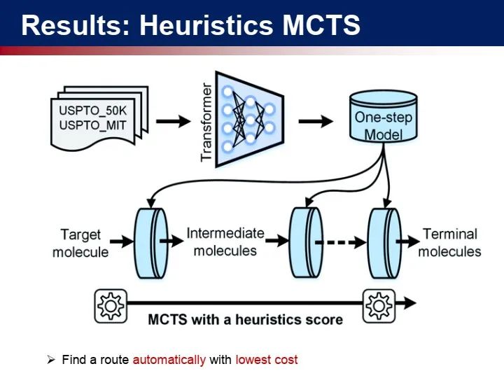 这项研究相当于把整个的化学逆反应合成分成两个模块。第一个模块是单步逆反应预测,每一种化合物都有数十种合成方式,但是这数十种合成方式可能是不知道的,这跟围棋不太一样。我们需要一个新的模型来预测分子的前体。第二个模块是多步逆反应搜索,这借鉴了AlphaGo的蒙特卡洛树搜索方法,实验达到了非常好的效果。
