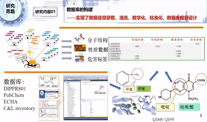 我们对这些对应关系建立了构效关系的系数矩阵数据库。我们对收集的数据在后期进行了清洗、数字化、标准化,采用SQL Server来规划设计数据库,建立了一系列的物质识别、基础物性、结构信息、毒性数据、安全性数据等一系列的不同类型的数据的收集表。这是前期数据库的工作。