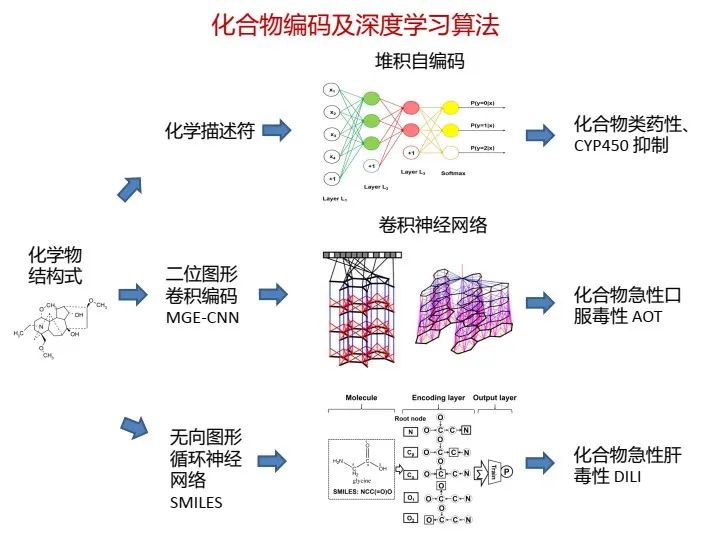 在基于人工智能的药物研发中,药物化合物的分子结构编码是必须解决的问题,一般包含三种方法:一是采用大量的化学描述符(descriptor),每个描述符描述分子的各种局部特征或有限的化学信息,加以组合形成矢量便可以提供化合物较为完善的信息;二是采用类似图卷积的思想,将不同半径范围内的分子子结构特征提取出来,形成分子指纹,例如类似于ECFP4环形分子指纹;三是采用自然语言处理技术,直接处理表示分子结构的线性字符串。