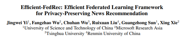 如今,隐私保护对于 AI 系统变得日益重要。由于推荐系统(如新闻推荐)需要使用大量用户的行为数据进行模型训练和推理,因此满足用户数据隐私保护的需求也十分迫切。联邦学习是一种可以实现隐私保护的模型训练框架,能够在用户数据不离开本地的前提下,联合大量用户进行协同模型训练。