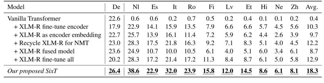 如表8所示,在利用多语言预训练模型 XLM-R 的诸多方法中,SixT 取得了最好的零资源跨语言迁移能力,在与训练数据的源语言距离较远的语言上也有较大的提升。