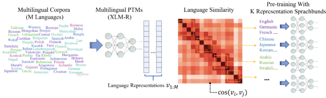 Sprachbund 是一个德语语言学术语,表示没有亲属关系的语言,由于长期共处于一个地区而在语言结构上产生共同区域特征的现象。研究员们认为预训练时语言之间较大的差异性是导致跨语言模型表现较差的原因。因此,研究员们提出了 Representation Sprachbund 的概念,用来指一系列具有相似嵌入表示的语言。研究员们通过跨语言预训练模型提取出语言的嵌入表示,将语言表示进行聚类为多个 Representation Sprachbund,针对每一类嵌入表示相似的 Representation Sprachbund 语言进行预训练。在 XGLUE 和 XTREME 等多个跨语言基准任务上开展的实验表明,本文的方法能够在基线模型基础上取得显著提升。