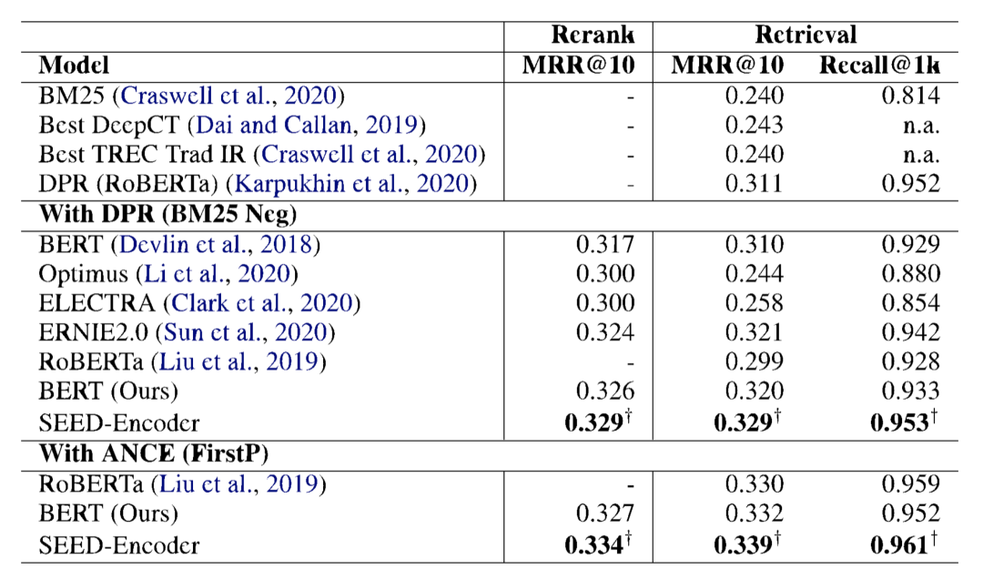 大量实验表明,相比于其他预训练语言模型,SEED-Encoder 的效果有显著的提升;同时也减少了在下游任务上微调所需要的训练轮次,证明了本文所提出方法的有效性。