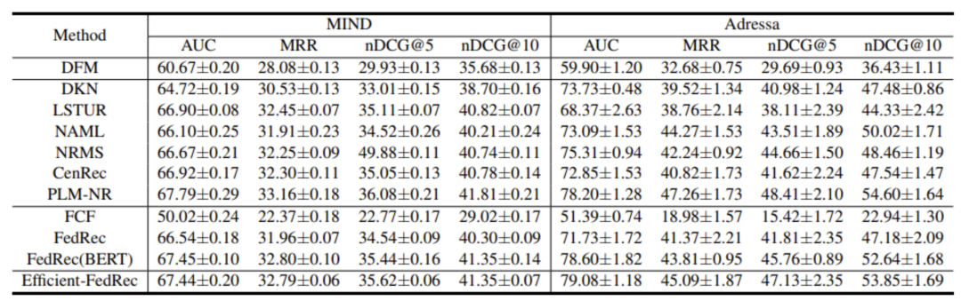 研究员们基于 MIND 和 Adressa 数据集进行了实验。表4中的结果显示,Efficient-FedRec 能够取得与依赖中心化数据存储的新闻推荐方法相似的推荐性能。