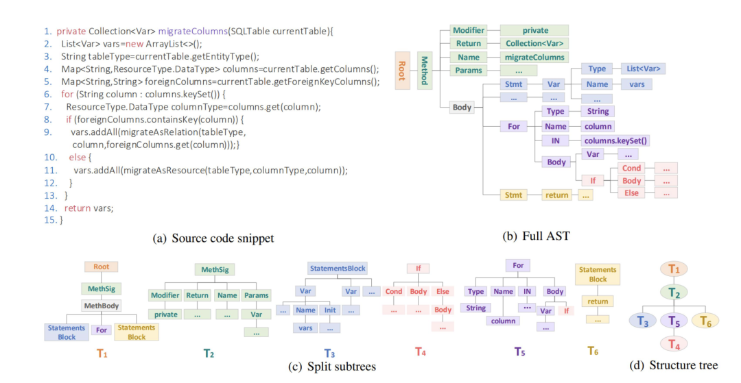 图1:代码及其抽象语法树(AST),切分的子树以及结构树的示意图