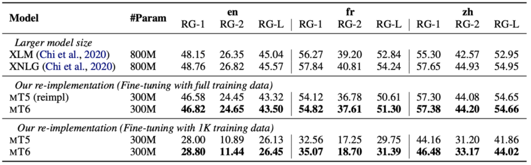 如表7所示,对于 Gigaword 多语言文本摘要任务,mT6 在3个语言上超越了 mT5,并且在低资源的场景下展现了更好的效果。