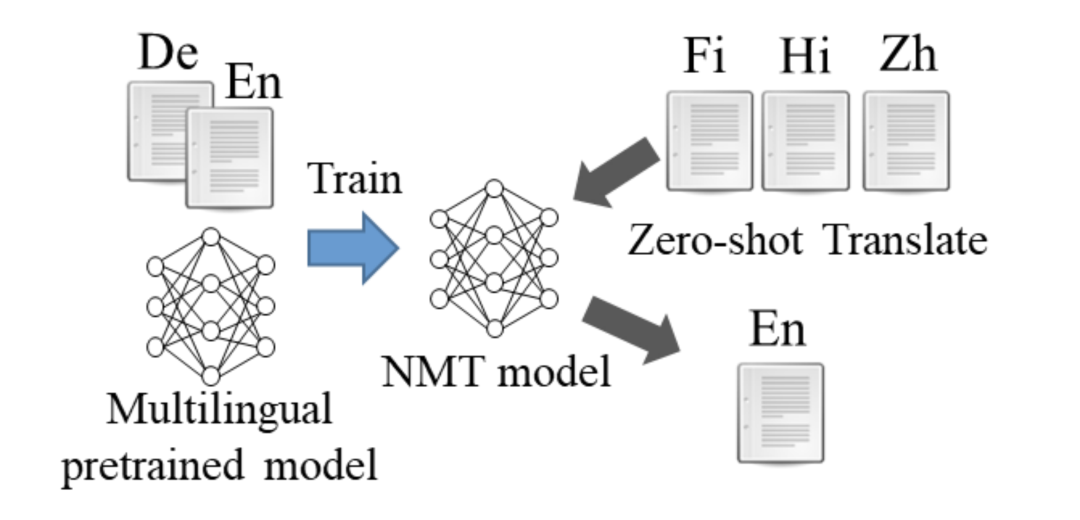 图中 NMT 模型只需要一个训练好的 MPE 和英德双语语料,训练后便可将100种源语言翻译到英语,而无需利用Fi, Hi, Zh等语言的单语或双语信息。