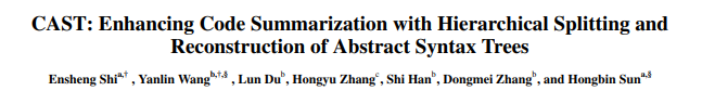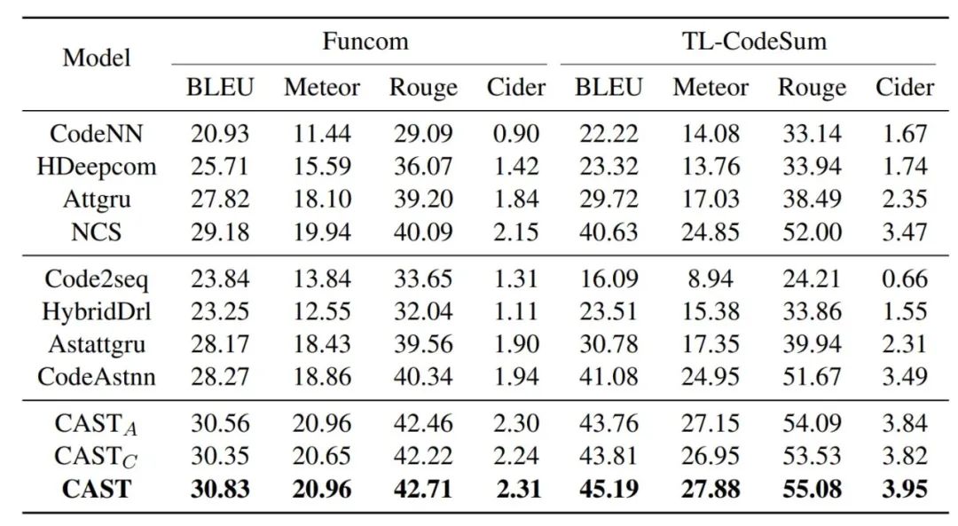 CAST 模型选择了常用的序列到序列的架构,主要包含三个模块:AST 的编码器、代码编码器和摘要解码器。AST 的编码器用来建模代码的语义和结构信息;代码编码器用来建模变量名层面的词汇和语义信息;解码器则结合两个编码器得到的代码表征以及复制机制来生成代码摘要。