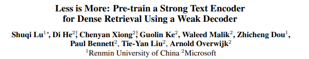 近年来,在搜索、推荐以及问答等多种场景中,Dense retrieval 技术受到了越来越多的关注。在这些场景的第一阶段检索中,Dense retrieval 模型通常采用双塔结构,利用编码器模型首先将用户侧(查询、浏览历史或问题)和语料库侧(文档或文章)分别编码为学习表示空间中的独立向量,然后采用简单的相似度计算(例如点积或余弦相似度)来进行高效检索。但以往的研究表明,常用的预训练语言模型在 Dense retrieval 场景中,对文本的编码并不是十分有效,尤其是当文本序列大多长于128个词时。