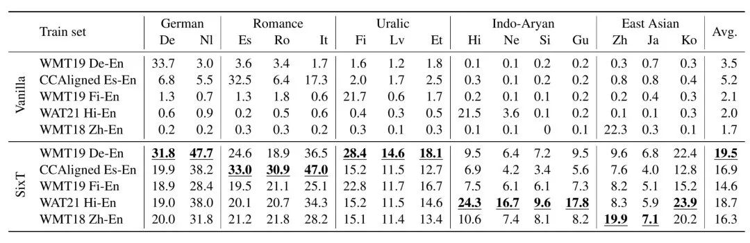 如表10所示,一般来说,SixT 在与训练数据集源语言类似的语言上的迁移能力更强。在本文中,研究员们还提出利用 SixT 的零资源跨语言迁移能力实现低资源机器翻译的两个建议:一是更大的训练数据集迁移效果更好;二是尽量在与迁移的目标语言更相近的训练数据上训练。