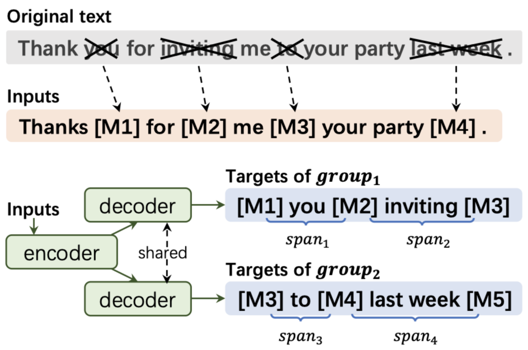 相较于 mT5,mT6 在训练目标上也有所不同。研究员们提出了部分非自回归解码(如图11所示),将原目标文本分割为若干组,在解码过程中要预测的单词依赖于输入文本和仅在同组的目标文本,而不是全部已生成的目标文本。