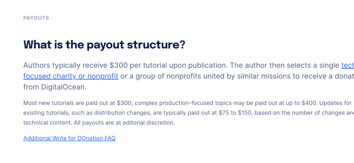 Borrelli发现大多数现有的写作项目薪酬都在250美元到400美元之间,而他写一篇技术文章平均需要8个小时,这样算下来,技术写作甚至比他朝九晚五的编码工作还要赚钱。如果你与这些公司取得了合作,那一个月只写四篇文章就能赚到1000美元。