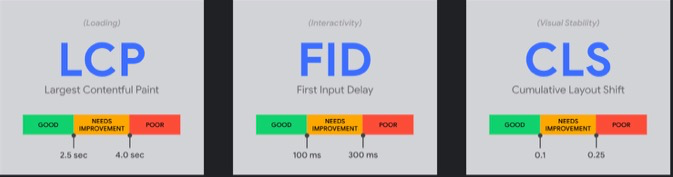 目前的 Web 核心指标由三个方面构成 — 页面加载性能、交互性、视觉稳定性,包含如下三个指标及阈值: