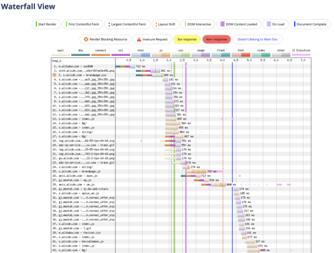 输入 URL 后我们可以简单的选择一个 simple configuration 进行测试,默认会执行 3 次测试。这里我们可以看到页面的一些核心指标,可以点开对应的指标项进行更详细的分析,在 Waterfall 页面我们也可以很直观的看到当前页面的请求顺序、请求耗时、关键节点(FCP、LCP等等)