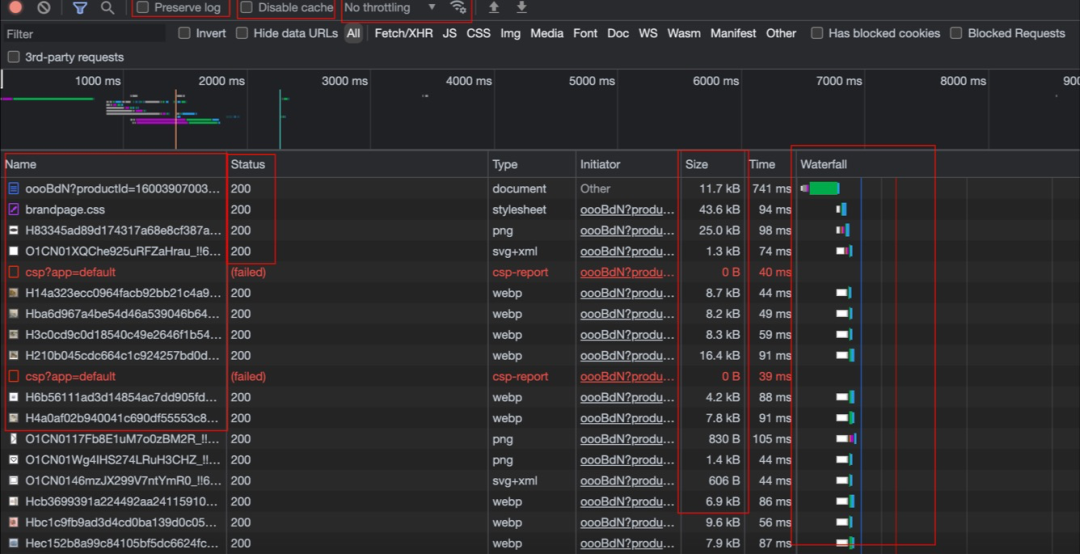 如上图所示,这是我们很熟悉的 Network 界面,功能上我用红框大概做了一下划分: