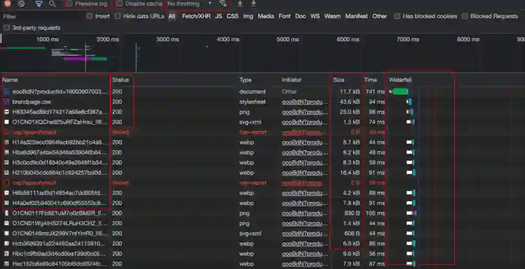 选项区:Preverse Log 可以在面板中保留网络请求,在页面重定向、当页跳转时可以保留之前页面的日志;Disable Cache可以屏蔽浏览器的 http 缓存机制;右侧的 No throtting 选择器可以对当前网络状态进行模拟(Fast 3G、Slow 3G 等等)