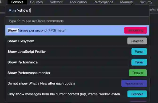在 Chrome 的 devtools 中我们可以执行 Cmd+Shift+P 输入 show fps 来快速打开 fps 面板,如下图所示: