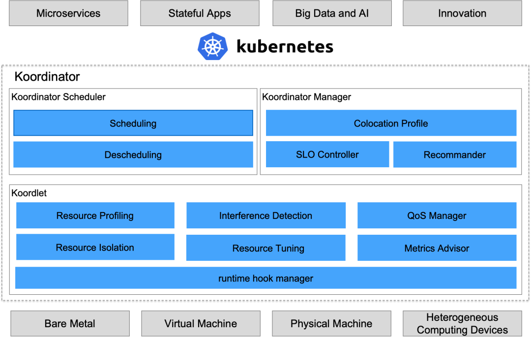 Koordinator: 取自 coordinator,K for Kubernetes,发音相同。语意上契合项目要解决的问题,即协调编排 kubernetes 集群中不同类型的工作负载,使得他们以最优的布局、最佳的姿态在一个集群、一个节点上运行。
