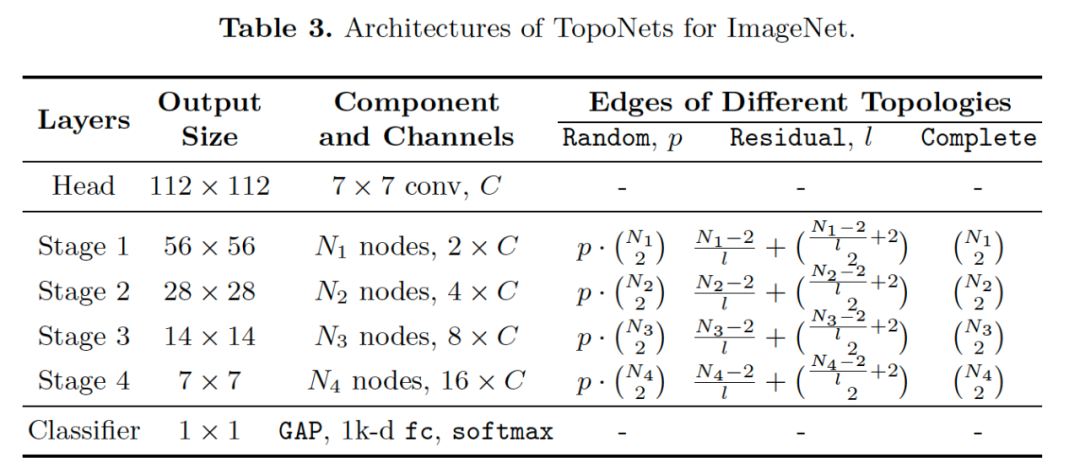 受限于现有网络较小的优化空间,拓扑结构只能在较小的范围内优化,限制了拓扑的表示能力。因此本节我们提出了一个更大的优化空间,并在这个优化空间下更严格的比较不同拓扑连接的性能差异。该优化空间的定义如表3所示。我们在相同的计算量下比较了随机、残差和完全图。随机图可以通过RandWire[3]中使用的ER、BA、WS生成器生成。实验结果如表4所示。