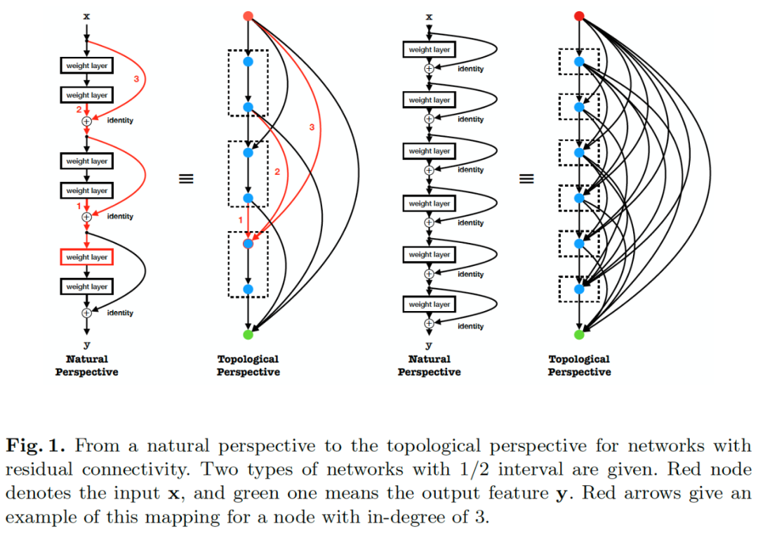 为了回答这些,我们提出一种新的拓扑视角来表达分析现有的网络结构。如图1所示,网络被表示为有向无环图(DAG),其中特征融合、卷积计算、归一化和非线性等特征计算被表示为节点,层与层之间的连接被表示为边,反映信息流的传递。图1给出了残差拓扑连接所对应的拓扑形式,我们首次展示了残差的拓扑连接是一种相对稠密的连接形式,当残差的间隔为1时,网络可以被表示为完全图(complete graph),即各个节点之间均有边连接。所有节点可以直接从输入获取特征,从输出获得梯度更新,这在一定程度上解释了残差连接能够有效的原因。
