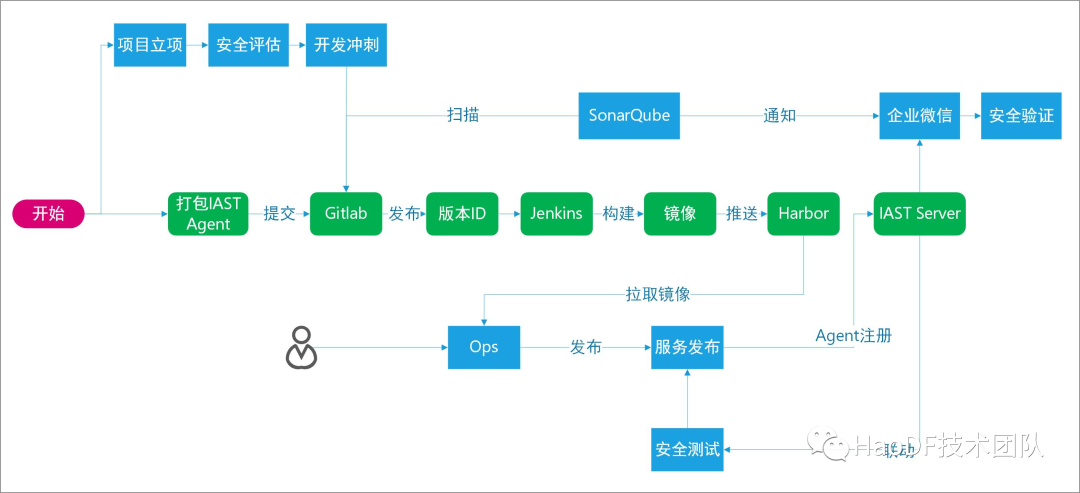 下图为好大夫目前集成开源IAST的流程图。在项目立项以后进入需求评审,安全人员参与评审后决定是否需要评估此项目,然后开发人员进行编码,编码后提交gitlab会进行白盒扫描,结果反馈给安全人员,安全人员跟进检测结果。当测试人员通过ops系统进行测试环境的应用发版时候,IAST Agent会与开发人员提交的应用代码合并打包镜像,应用发版后IAST Agent会自动进行注册,通过采集分析功能测试数据自动化测试安全漏洞,若发现漏洞会将结果发送给安全人员确认。至此IAST就融入了现有的CI/CD流程中。