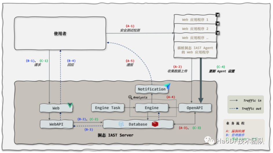 洞态IAST采用轻代理,重服务端的技术架构。具体架构及原理如下:Web服务器上安装 IAST Agent,用户(开发、测试或安全人员)对web服务发起功能性访问后,Agent 便开始采集访问数据,并与 OpenAPI 服务通信上报数据和Hook规则的拉取。OpenAPI 将数据存储到数据库中(MySQL 和 Redis),Engine 会在分析后这些数据后,识别漏洞信息并保存下来。安全人员可以通过WebAPI来查看漏洞信息。