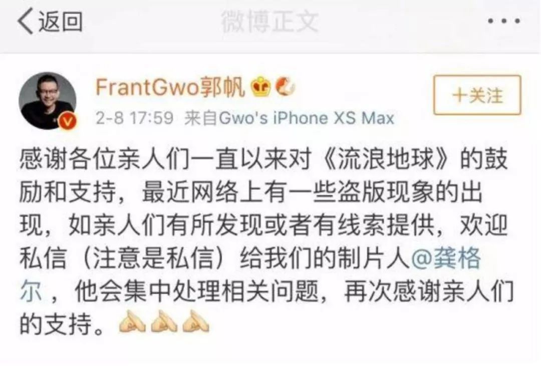 龚格尔表示,为防止盗版,《流浪地球》从源头上严格把控,在制作端更是层层加密,减少一切非必要素材接触。在上映期间,安排了三个防盗版团队全天候监控,并且已经在微博开通了举报盗版的直通渠道。但这一切举措依然难以阻止盗版。