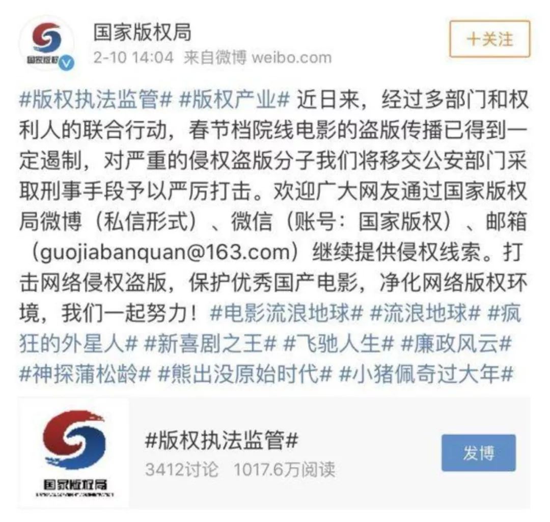值得庆幸的是,无论是国家层面或是民间层面的版权保护意识都有所加强。今年2月5日,国家版权局公布了2019年度第一批重点作品版权保护预警名单,八部国产贺岁片全部在列。