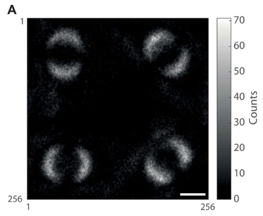 在实验的第一个实现中,我们获得了4个独立的量子纠缠图像,对应于 θ2 = {0° , 45° , 90° , 135° }的四个方向。将ICCD相机获得的阈值帧直接相加得到的图像如下图所示:
