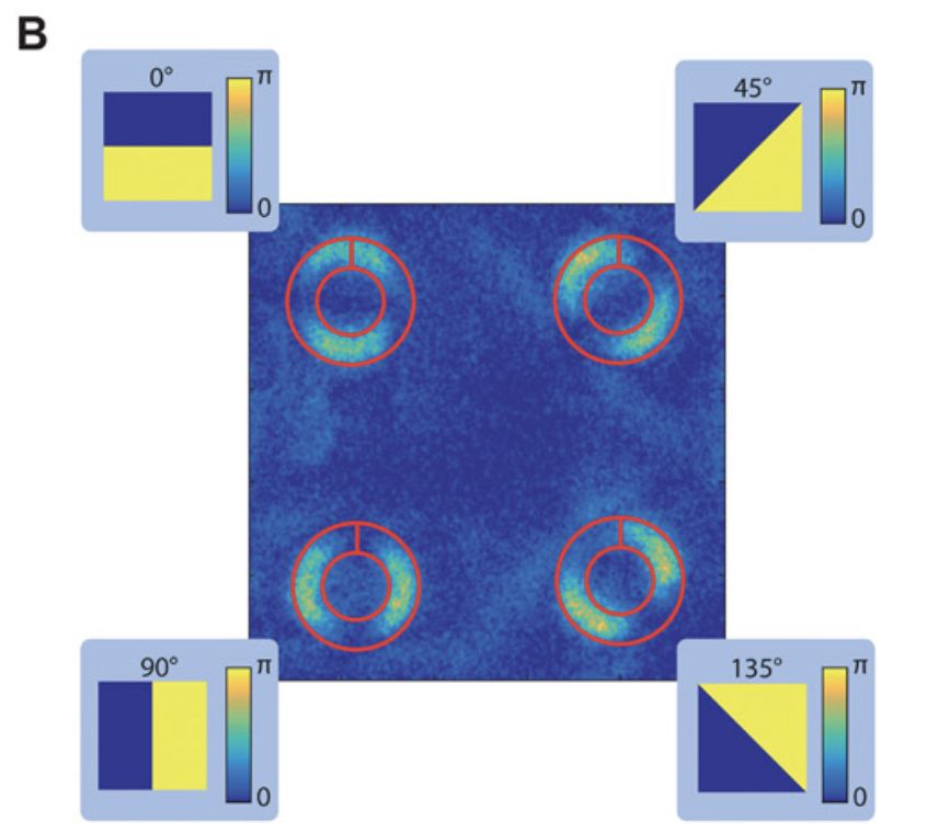 研究人员对每个滤波器以不同的方式偏离arm 2中的光束,从而获得相机光敏阵列不同部位的相位圆的四幅并行图像。