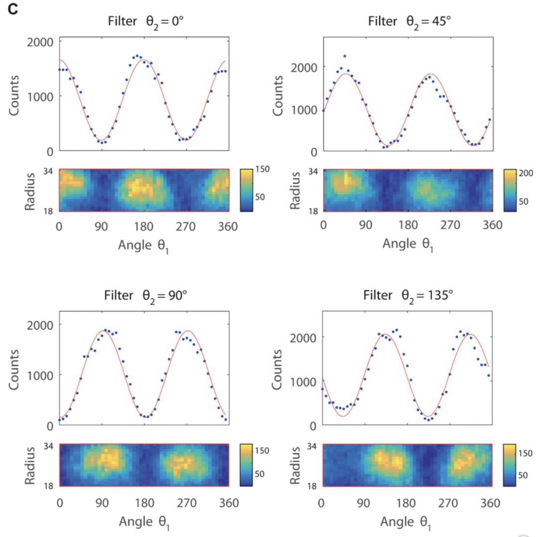 在这个实验过程中,研究人员为了对贝尔不等式进行成像,他们使用了简化版的公式1与通过SPDC生成的EPR状态所表现出的空间相关性结合,来获得贝尔行为的空间分辨率图像。