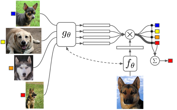 匹配网络将嵌入和分类相结合,形成端到端可微的最近邻分类器。对于模型的预测,ŷ是标签的加权和,yᵢ是训练集。权重是成对相似性函数a(𝑥̂, xᵢ),查询(测试)样本和支持(训练)样本之间的相似性。匹配网络的关键是相似函数的可微性。