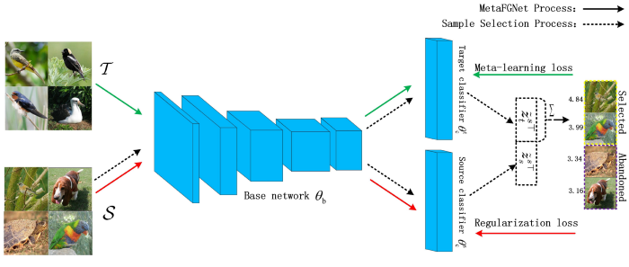 除了目标任务网络外,MetaFGNet还使用辅助数据训练网络。这两个网络共享初始层(基础网络)以学习一般信息。这种方法也被称为多任务学习。将辅助数据(S)与目标数据(T)进行训练,对目标训练产生正则化效果。MetaFGNet还使用了一个名为sample selection的过程。辅助数据中的样本通过网络,对目标分类器的相似度打分,同时也计算源分类器。如果相似性高,得分也会高。只选择得分阈值以上的样本进行训练。这里主要假设辅助数据S应该具有与目标集T类似的分布。结果表明,该过程提高了整体性能。使用元学习方法进行训练效果有提升。