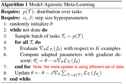 与模型无关的元学习(MAML)的目的是学习一个通用的模型,这个模型可以很容易地对许多任务进行微调,只需要几个迭代步骤。对于元批处理中的每个任务,使用基模型的权重初始化一个模型。采用随机梯度下降(SGD)算法更新特定任务的权值。然后,使用更新后权重的损失总和来更新元学习者的权重。这里的目标是,对于几个不同的任务,这些参数的损失将会很小。