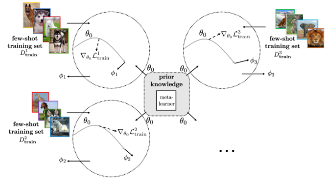 元学习意味着学会学习。元学习试图训练模型的参数,使其通过一个或多个梯度步骤(像人类一样)在新任务中表现最佳。模型的参数根据更新后的特定于任务的参数进行更新,使得任何任务在完成单一步骤后,其性能都是最高的。