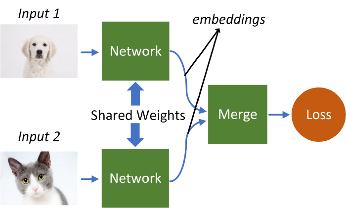 Siamese神经网络以两个样本作为输入,输出给定输入是否属于同一类的概率(或损失)。输入样本通过相同的网络(共享权值),它们的嵌入在损失函数中进行比较(通常使用基于嵌入的差异的度量)。在训练过程中,“网络”学会以更稳健的方式对输入进行编码。首先,在支持集(验证步骤)上对模型进行训练,以学习相同/不同的配对。然后,将测试样本与训练集中的每个样本进行比较,得到基于学习的编码后的测试样本与每个类(one-shot task)的相似度。它是在few-shot学习领域中第一个成功的模型之一,并成为其他模型的基础。