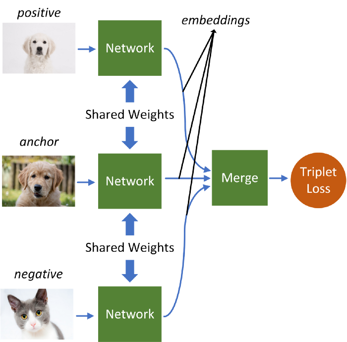 Triplet Network是对Siamese 网络的扩展。Triplet网络不使用两个样本,而是使用三个样本作为输入:positive、anchor和negative样本。Positive样本和anchor样本来自同一类,negative样本来自不同类。Triplet损失的安排使得anchor的嵌入靠近positive而远离negative。通过这种方式,网络在提取嵌入信息时变得更加健壮。Triplet Networks已应用于人脸识别数据集,显示出非常好的性能。