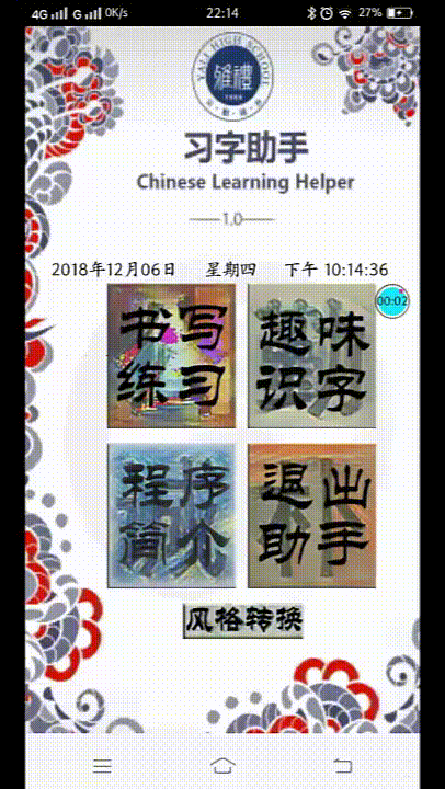 我把基于计算思维与可视化编程软件来传承与弘扬中国传统汉字文化的想法和指导老师彭宇汇报,彭老师立即拍板说创意非常棒,可以成为一个为小朋友们习字培养兴趣打好基础的好软件,并兴奋地说 “就取名好好写字吧”!但我觉得,“好好写字” 的作品名字不够大气,我们的软件面向对象将是各年龄段、不同种族的汉字爱好者,同时也能成为同学们学习汉字的好帮手。后来,我们决定给它起一个朗朗上口,优雅易记,又涵括中国元素的名字 — “习字助手”。