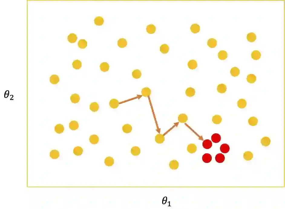 ▲ 红星是在参数空间中探索的开始位置,红色连线是初始的几步探索,蓝色圆点是后期在参数空间探索留下的足迹——所以有些库将抽样得到的参数列表用英文 trace(迹) 表示。