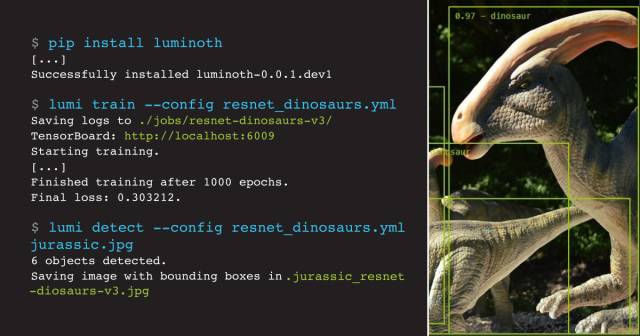 它还提供了一些工具以轻松完成构建 DL 模型所需要的工程工作:将数据(图像等)转换为适当的格式以馈送到各种操作流程中,例如执行数据增强、在一个或多个 GPU 中执行训练(分布式训练是训练大规模模型所必需的)、执行评价度量、在 TensorBoard 中可视化数据或模型和部署模型为一个简单的 API 接口等。所以因为 Luminoth 提供了大量的方法,我们可以通过它完成很多关于计算机视觉的任务。