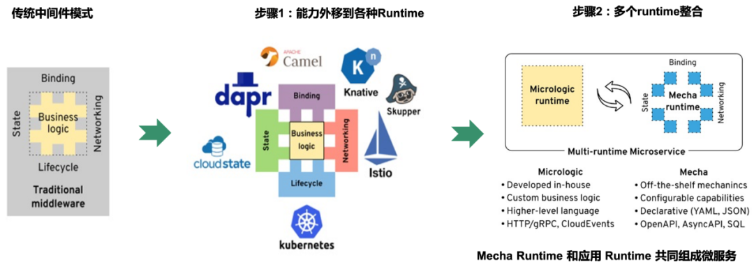 在 ServiceMesh 初步成功并且 Sidecar 模式被云原生社区普遍接受之后,各企业效仿 ServiceMesh 将应用需要的其他分布式能力外移到各种 Runtime,这逐渐演变成了一个趋势。这些 Runtime 会逐渐整合,最后和应用 Runtime 共同组成微服务,形成所谓的 "Multi-Runtime" 架构,又称 Mecha: