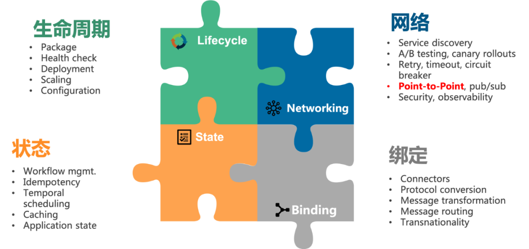 而 ServiceMesh 只解决了服务间通讯的需求,而现实中的分布式应用存在更多的需求,Multi-Runtime 理论将这些需求归结为四大类: