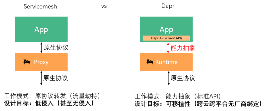 工作模式不同的背后,反映出 Dapr 和 ServiceMesh 在设计目标上的差异: