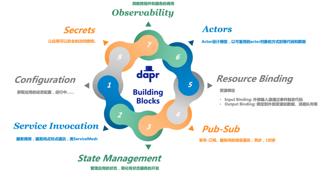 下图是 Dapr 目前已有的构建块,以及对他们所提供的能力的简单描述(其中 Service Invocation 对应 ServiceMesh 的服务间通讯能力):