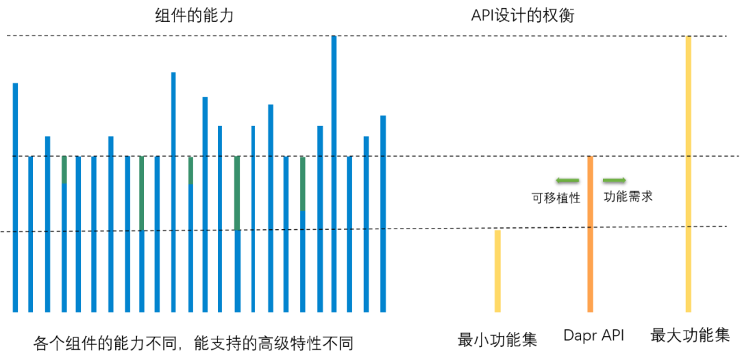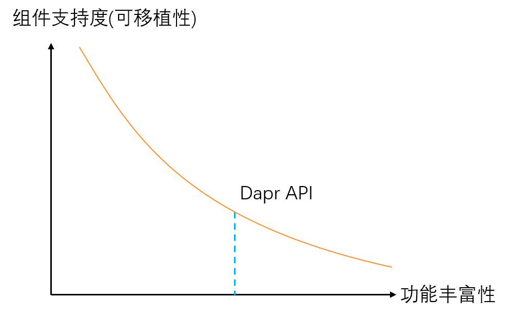 因此 Dapr API 在定义和后续演进时需要做权衡和取舍:不能过于保守:太靠近左侧,虽然可移植性得以体现,但功能的缺失会影响使用;也不能过于激进:太靠近右侧,虽然功能非常齐备,但是组件的支持度会变差,影响可移植性。