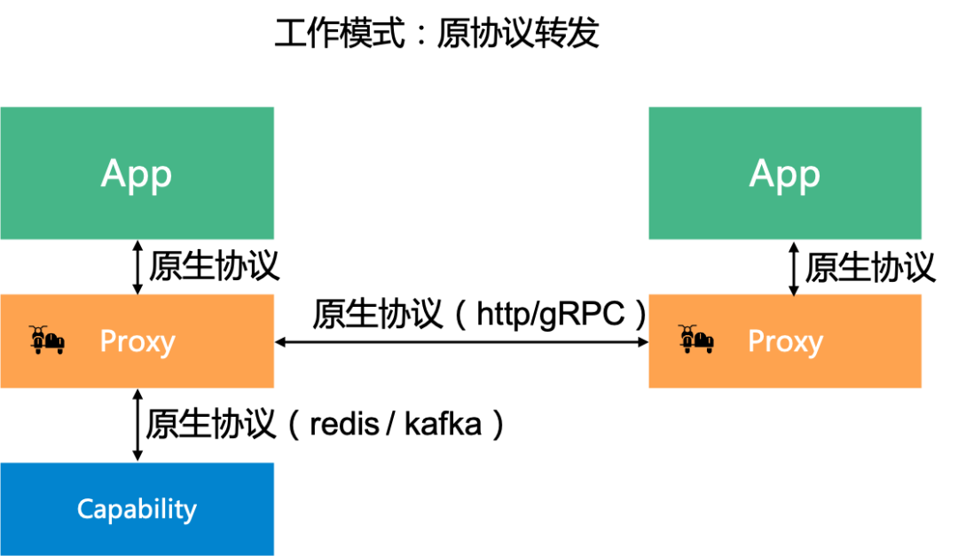 ServiceMesh 的 Sidecar 接收到是 App 发出的原生协议的请求,然后转发给另一端的 Sidecar 进而转发给目标 App;或者,对于 Redis/Kafka 等的支持是 Sidecar 将原协议转发给 Redis/Kafka 服务器。在这个过程中,ServiceMesh 的 Sidecar 原则上不修改协议,只做转发("Forwarding"),Sidecar 扮演的是代理("Proxy")的角色。