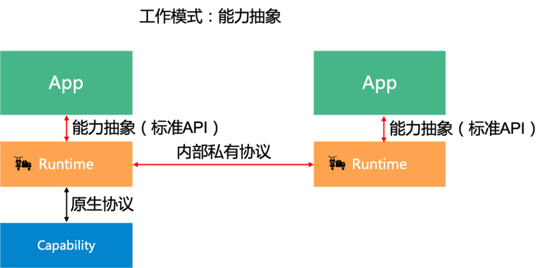 前面我们在介绍 Dapr 和 ServiceMesh 的本质差异时强调过:Dapr 的工作模式是能力抽象,Sidecar 原则上对应用只暴露抽象之后的分布式能力,屏蔽了底层具体的实现和通讯协议,不做"转发"而是提供"能力",Sidecar 扮演的是运行时 ("Runtime") 的角色。