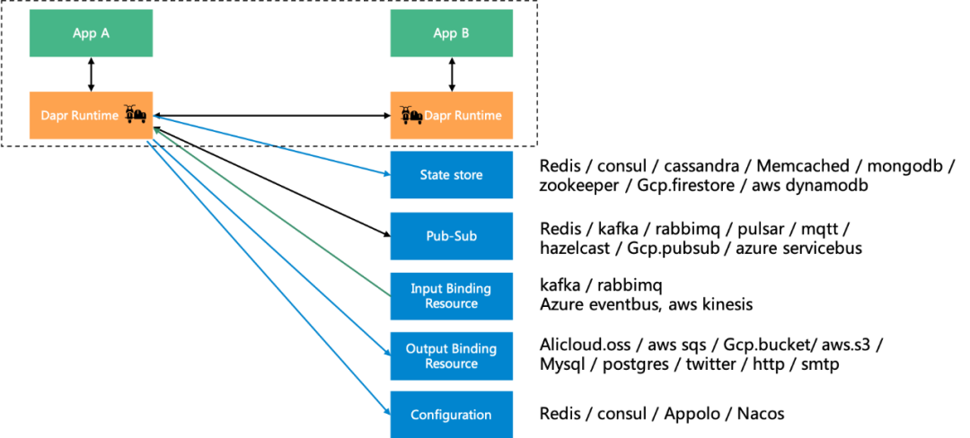 ServiceMesh 关注于服务间通讯,即下图中虚线部分;而 Dapr 除了服务间通讯之外,还适用于诸多其他的场景,如状态存储、消息的发布订阅、资源绑定、配置等。