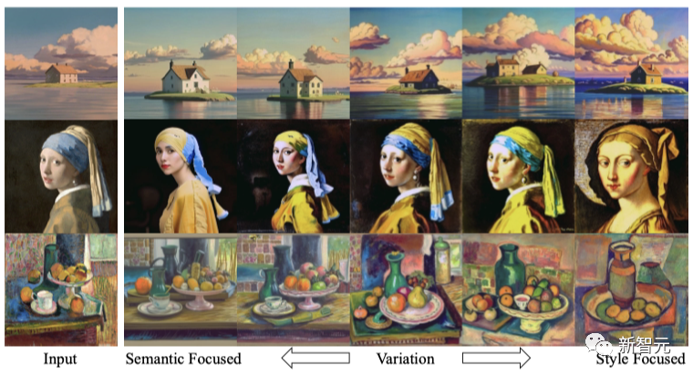 在下图中,作者首先生成输入图像的变体,然后以语义(左边)或风格(右边)为重点对其进行操作。